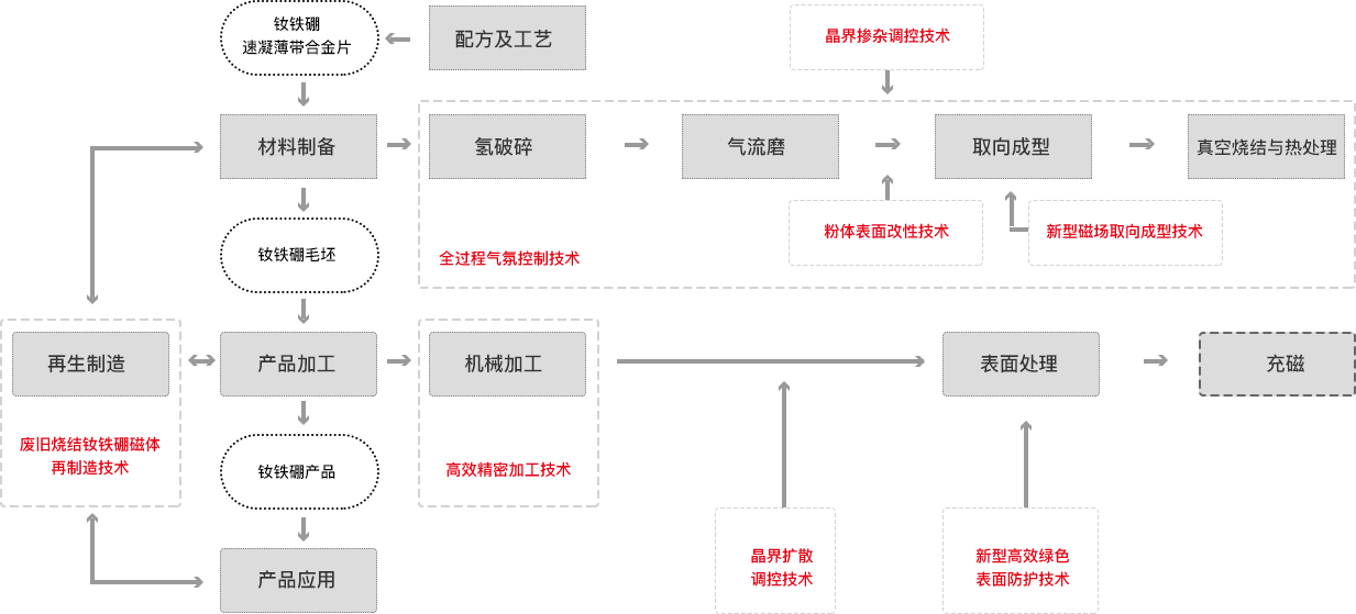 晶界摻雜調(diào)控技術(shù)是公司開發(fā)出超高磁性能系列、高熱穩(wěn)定性系列、低重稀土系列燒結(jié)釹鐵硼磁體的關(guān)鍵核心技術(shù),也是廢舊磁體回收再生過程的核心技術(shù)。