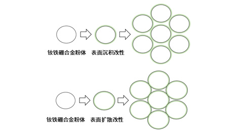 公司創(chuàng)新開發(fā)出多種釹鐵硼合金粉體表面改性技術(shù):包括物理氣相沉積重稀土金屬膜層技術(shù)、粉體表面擴(kuò)散改性技術(shù)、化學(xué)合成膜改性技術(shù)等。通過粉體表面改性,改善了粉體的流動性和抗氧化性,提高了粉體表層的各向異性場,最終提高了材料的矯頑力。